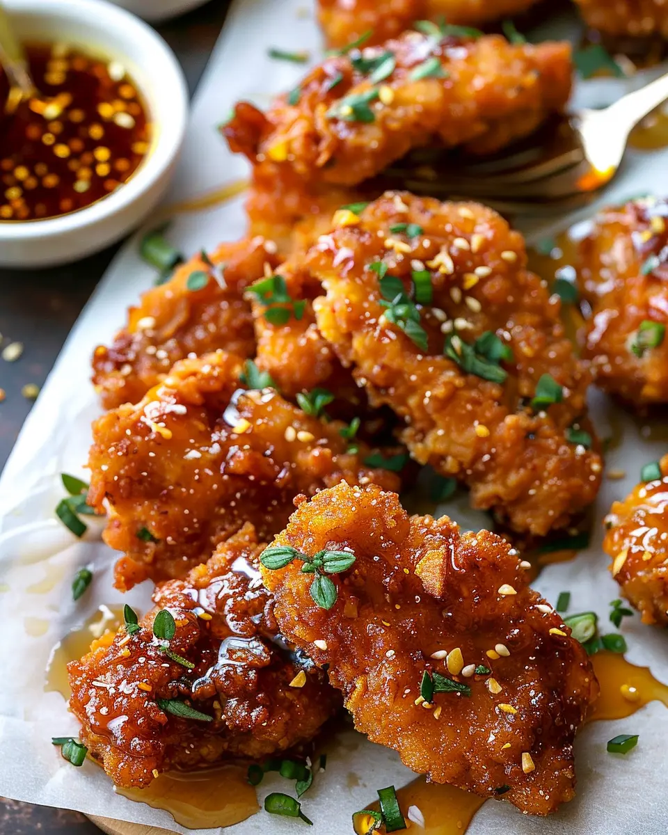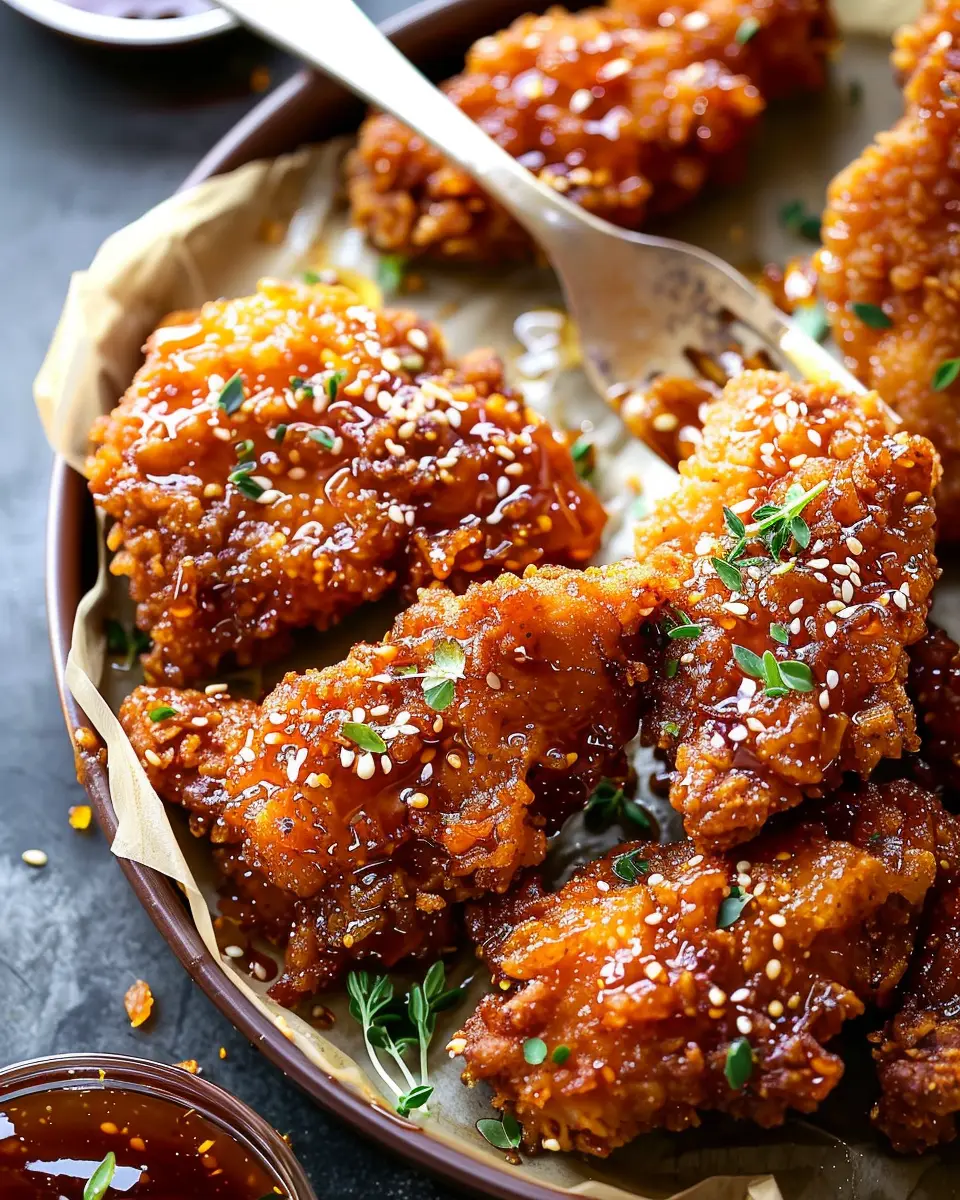 - Dip each piece of chicken into the hot honey, allowing any excess to drip off.