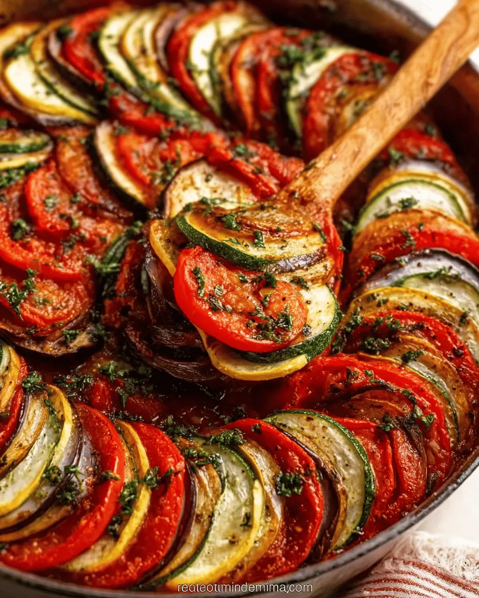 A delicious baked ratatouille recipe featuring fresh tomatoes, zucchini, and eggplant, offering a delightful twist on a classic comfort dish.
