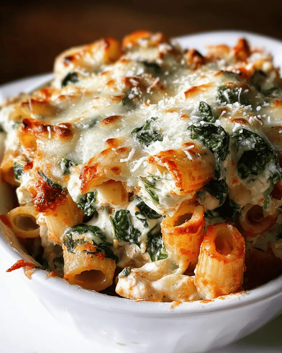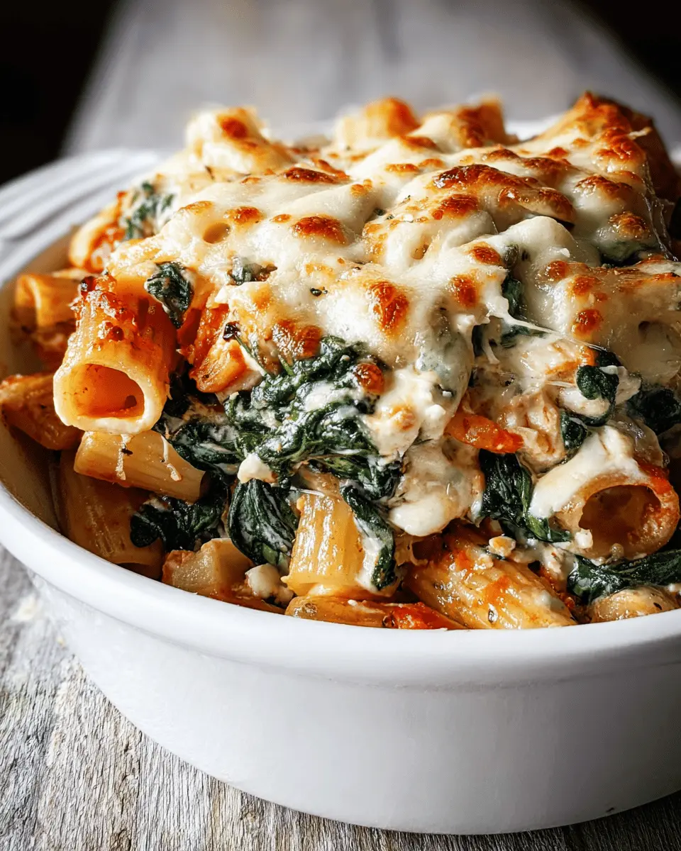 Baked Rigatoni with Spinach and Ricotta is a comforting dish that combines the flavors of creamy ricotta and savory spinach with hearty pasta.
