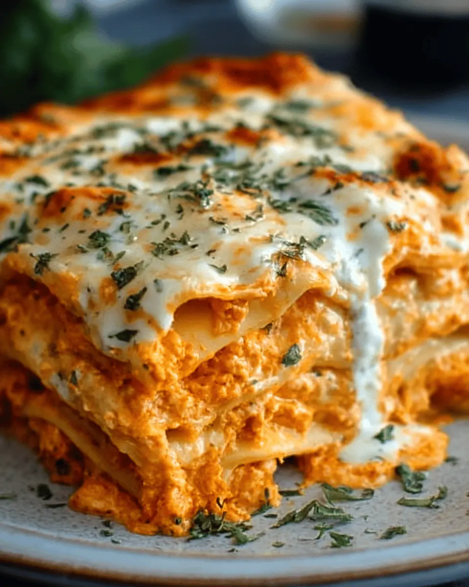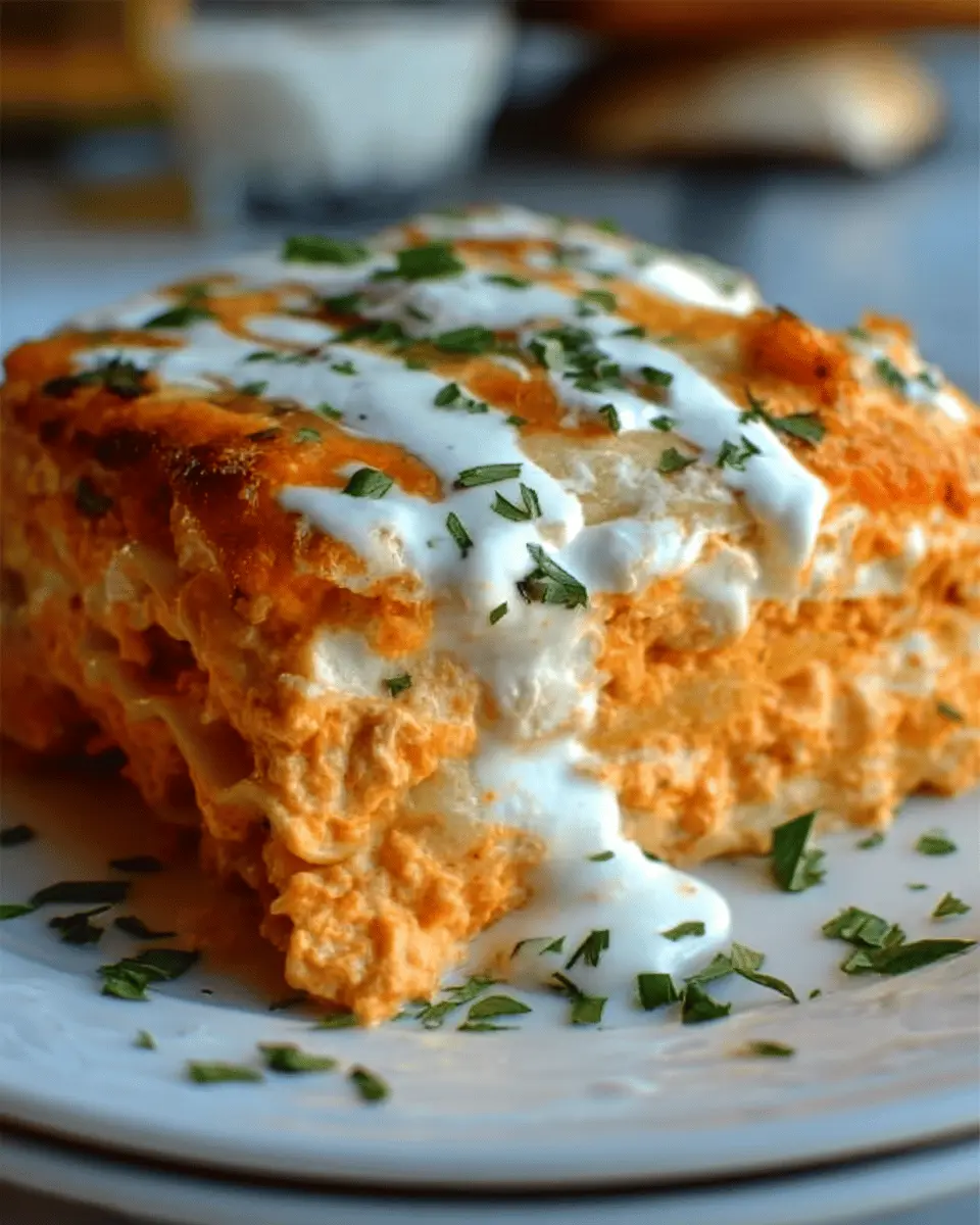 Once out of the oven, let your buffalo chicken lasagna cool slightly—this makes it easier to slice. Serve generous portions, and don’t forget to garnish with freshly chopped parsley or green onions for that pop of color and extra flavor.