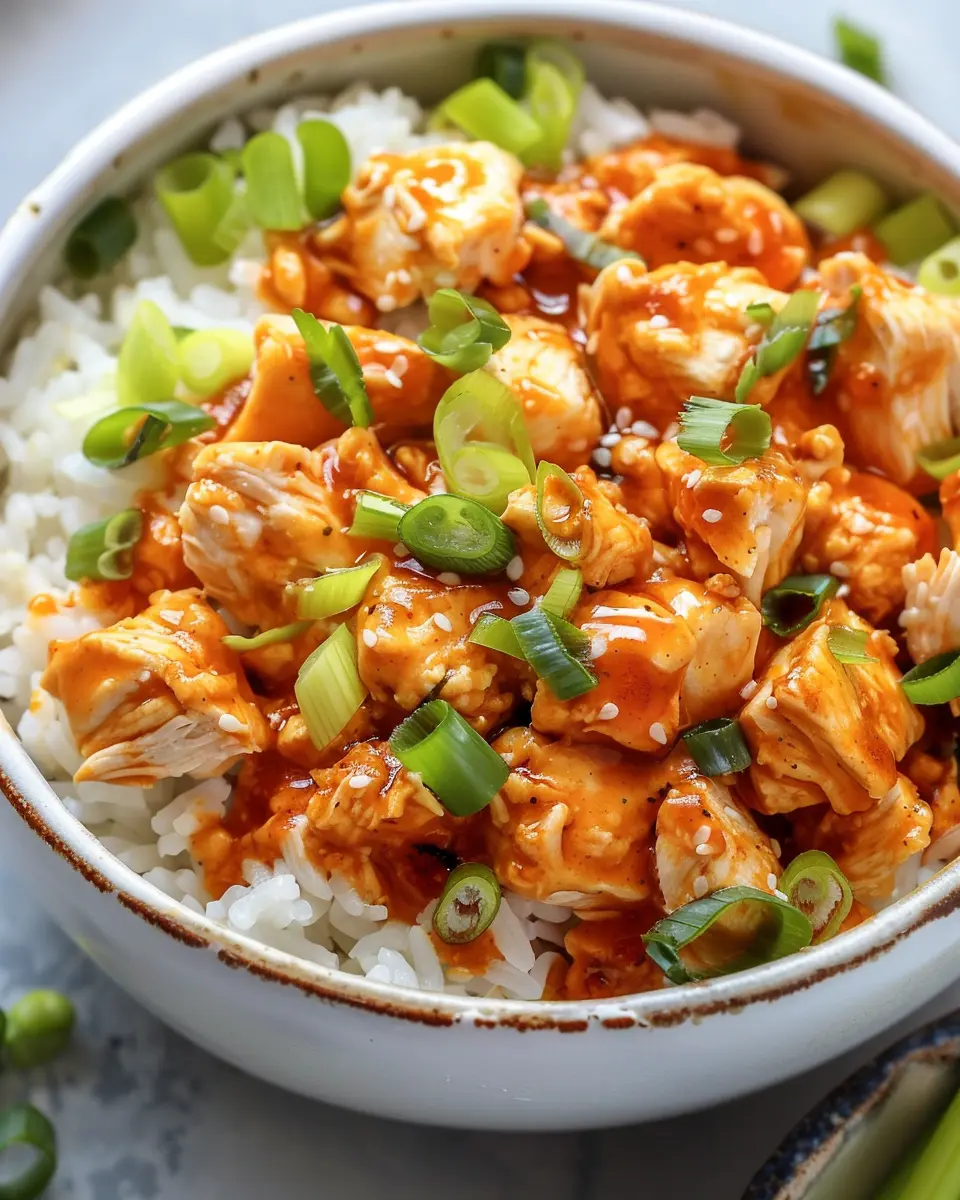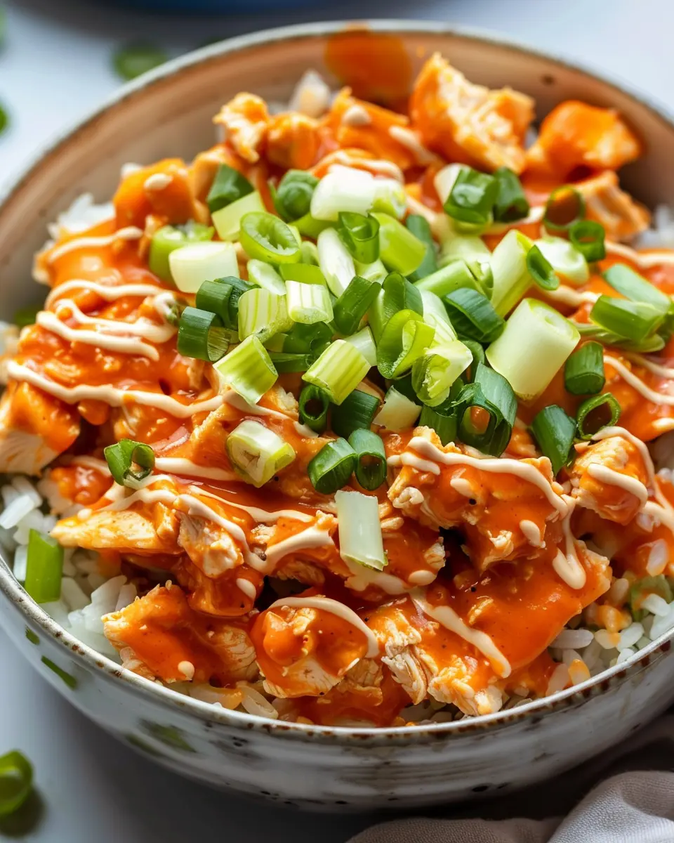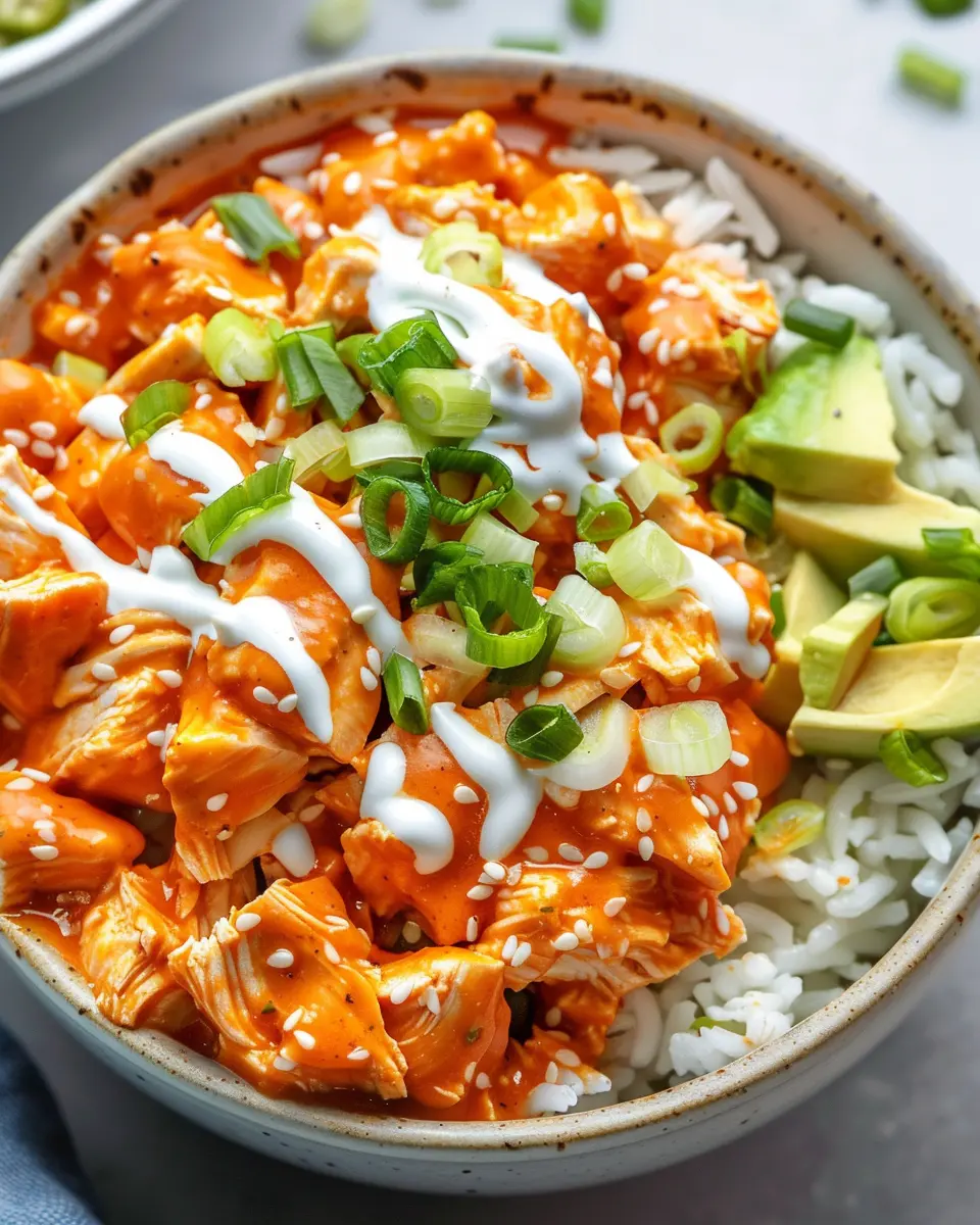- Layering: Start with a base of rice, then layer on the buffalo chicken, and finish with toppings like avocado or green onions.