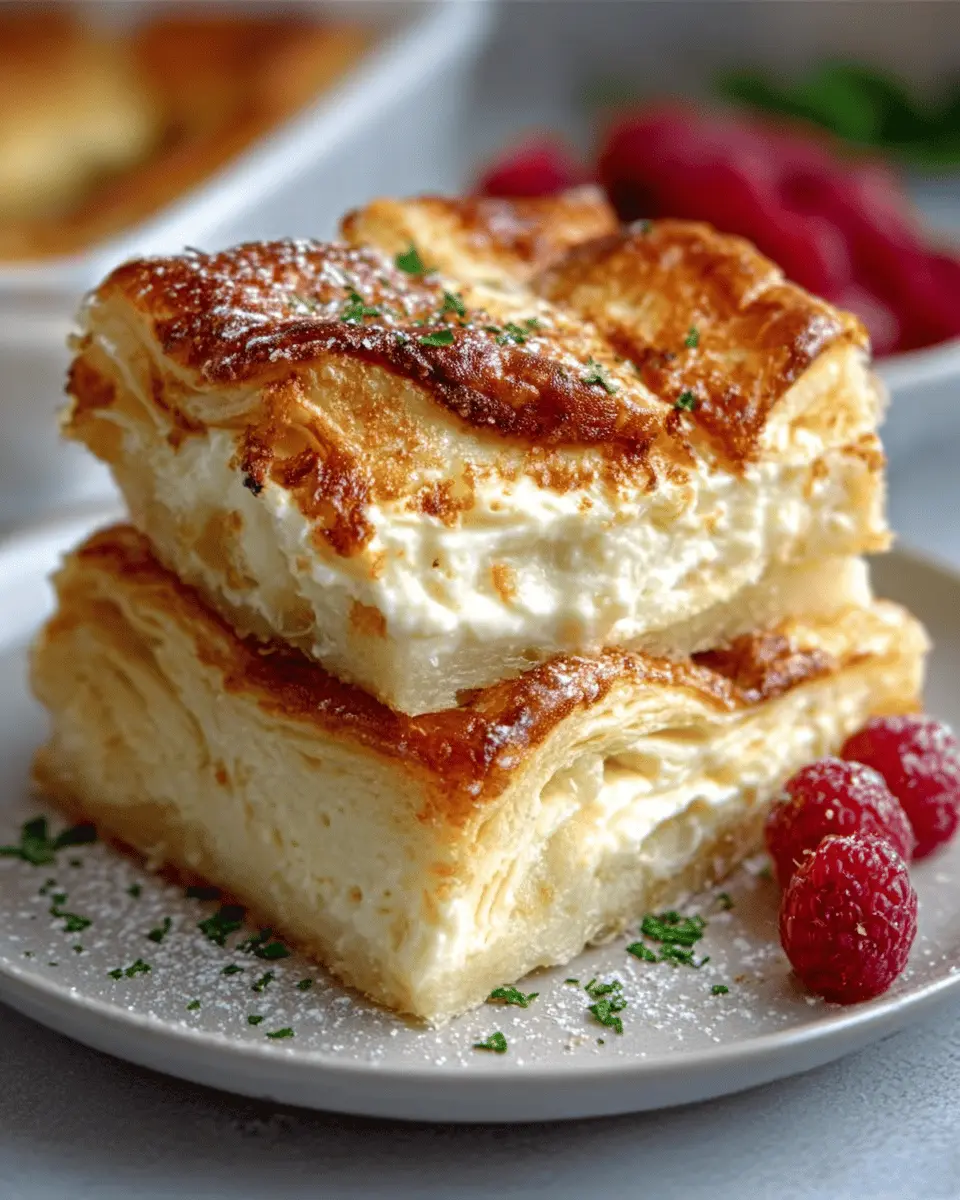 Pour the creamy cheesecake mixture over the crescent roll base, gently spreading it out. Fold the edges of the crescent rolls over the filling for that sweet, rustic look. Pop this masterpiece into your preheated oven and bake for about 25–30 minutes or until you see a golden brown crust. Keep an eye on it—every oven is different, and you don’t want it to over-bake.