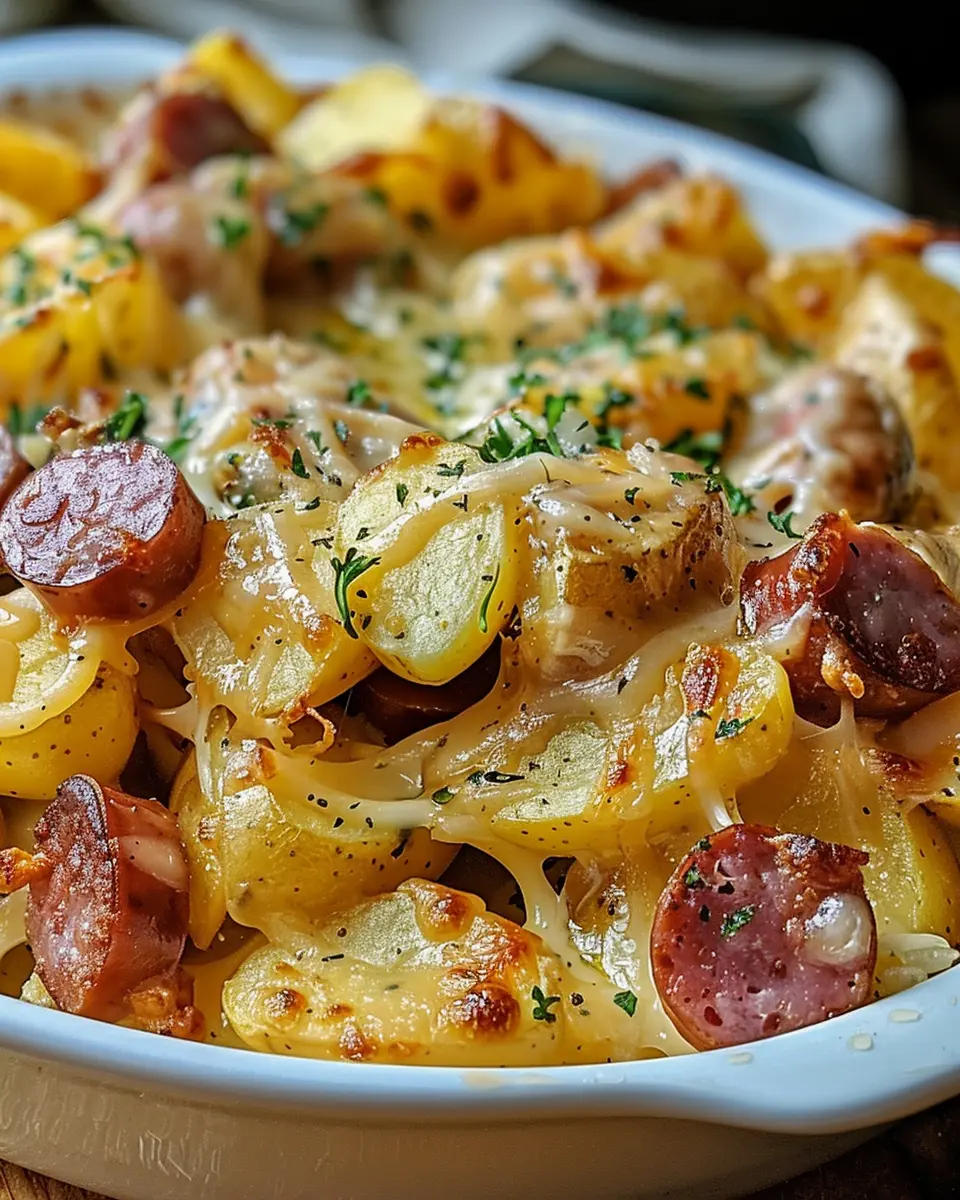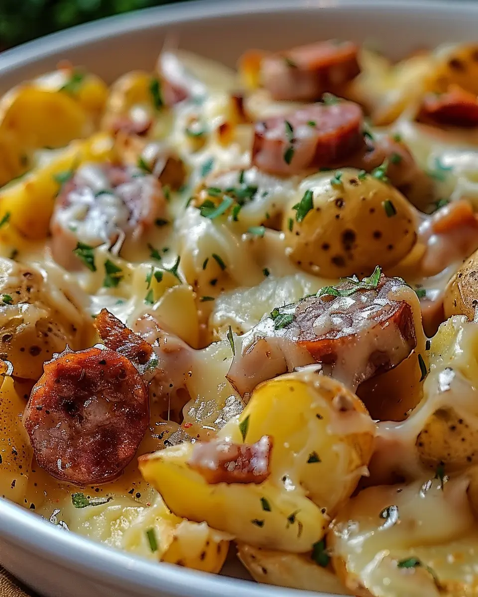 A creamy and cheesy dish combining potatoes and smoked sausage for a delightful taste experience.