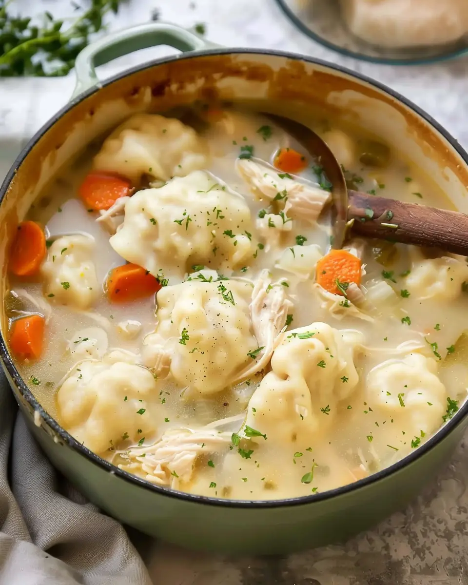 A warm and hearty chicken and dumpling soup perfect for cozy evenings.