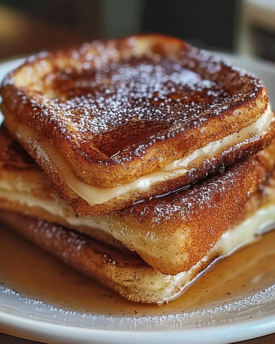 Indulge in the delightful flavors of churro stuffed French toast, perfectly dusted with cinnamon sugar.