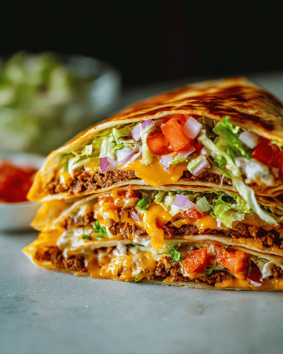 Once cooked, let them cool slightly before slicing in half to reveal your beautiful Copycat Crunchwrap Supreme.