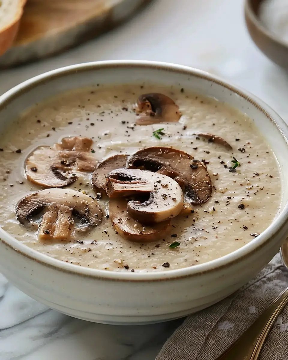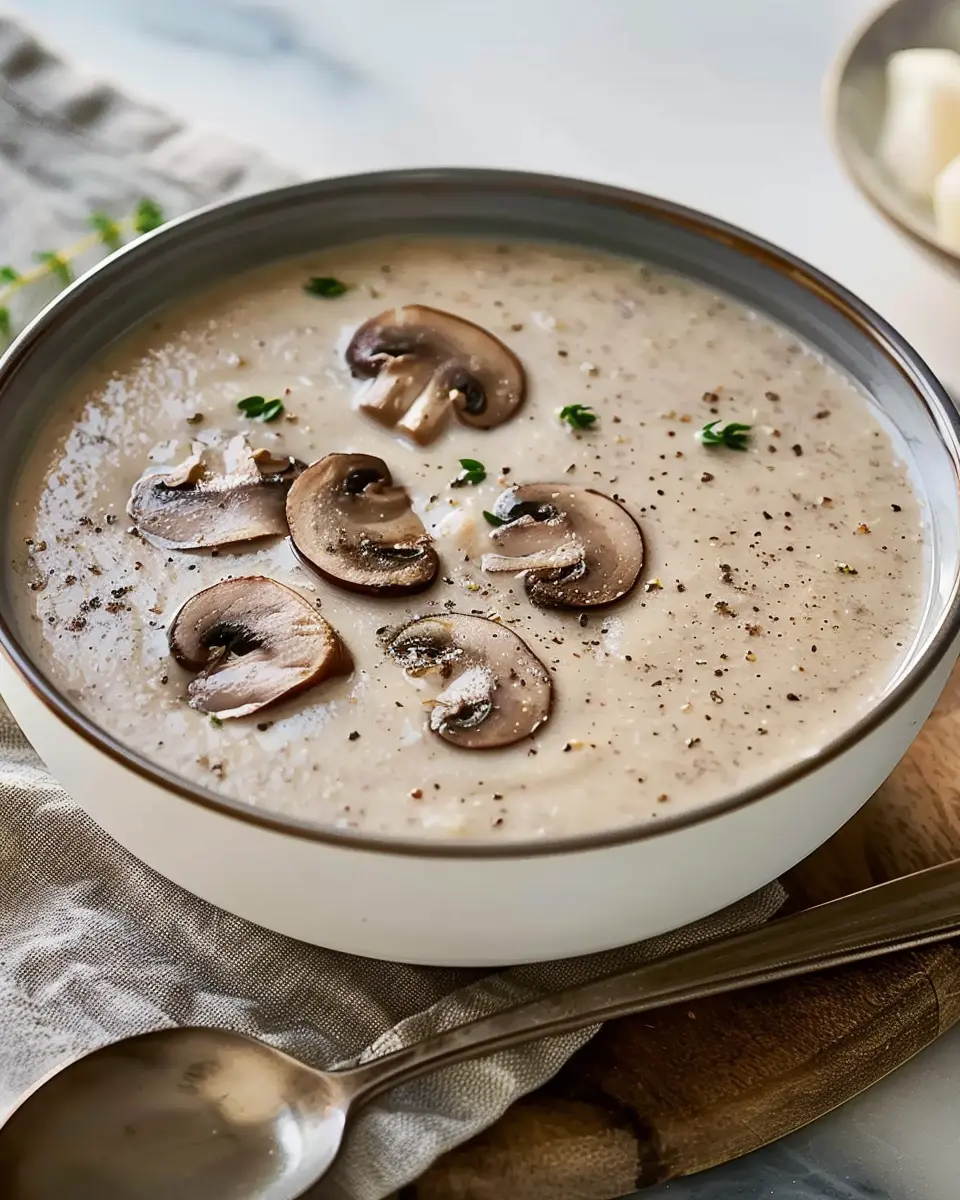 PrintCream of Mushroom Soup: Indulgent Recipe with Turkey Bacon and Herbs