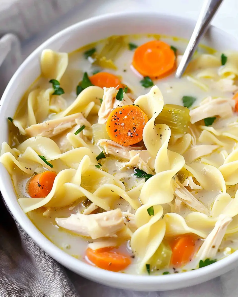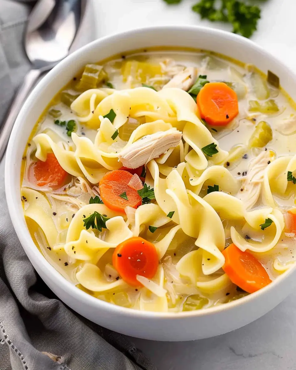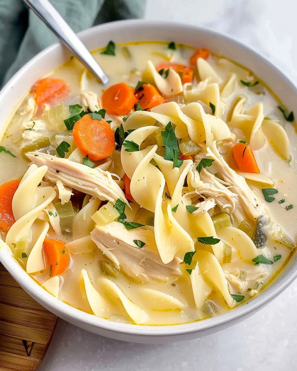 In conclusion, this creamy chicken noodle soup is more than just a meal; it’s a warm hug in a bowl. The rich, velvety texture combined with tender chicken and herbs makes it the perfect comfort food for any day of the week. Whether you’re feeling under the weather or just want to enjoy a cozy night in, this dish checks all the boxes.