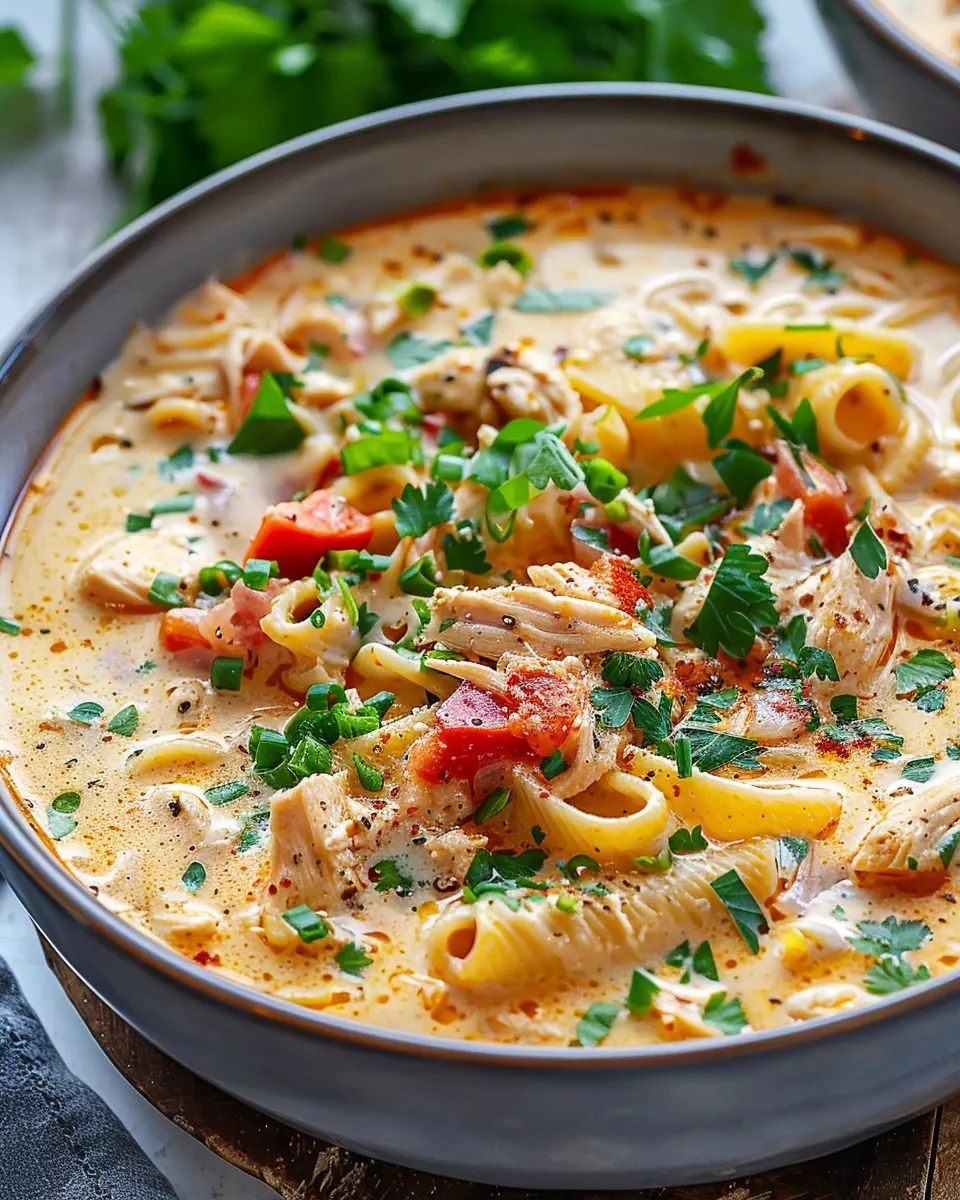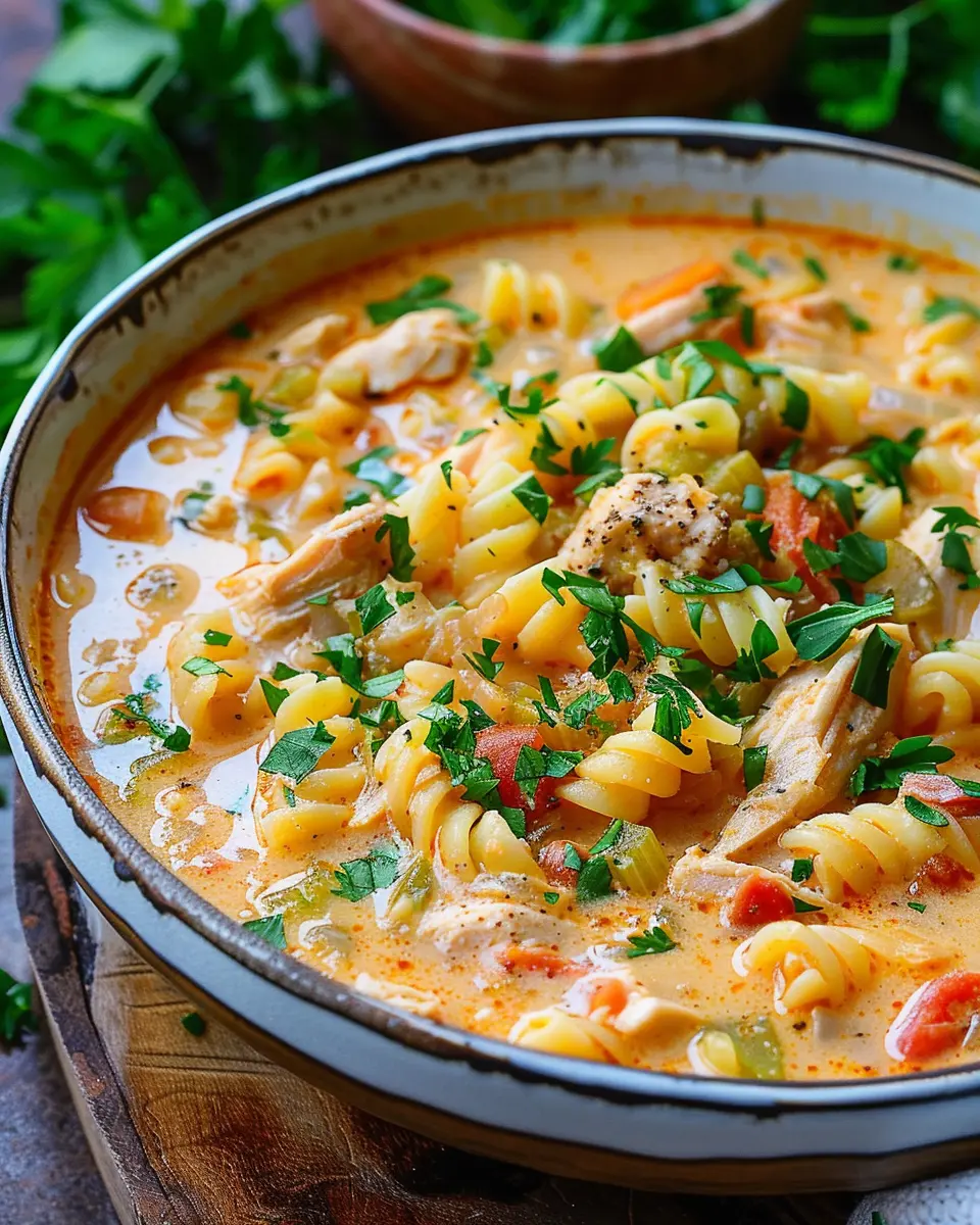A comforting and flavorful soup that combines creamy parmesan, cajun spices, chicken, and pasta for a delightful meal.