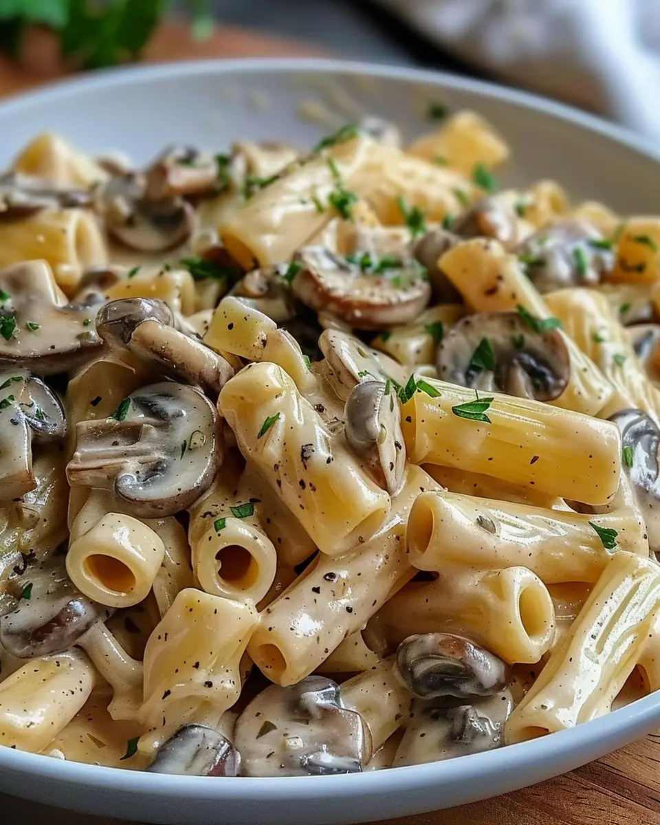 A deliciously creamy pasta dish featuring savory mushrooms and crispy turkey bacon, all cooked in one skillet for easy cleanup.
