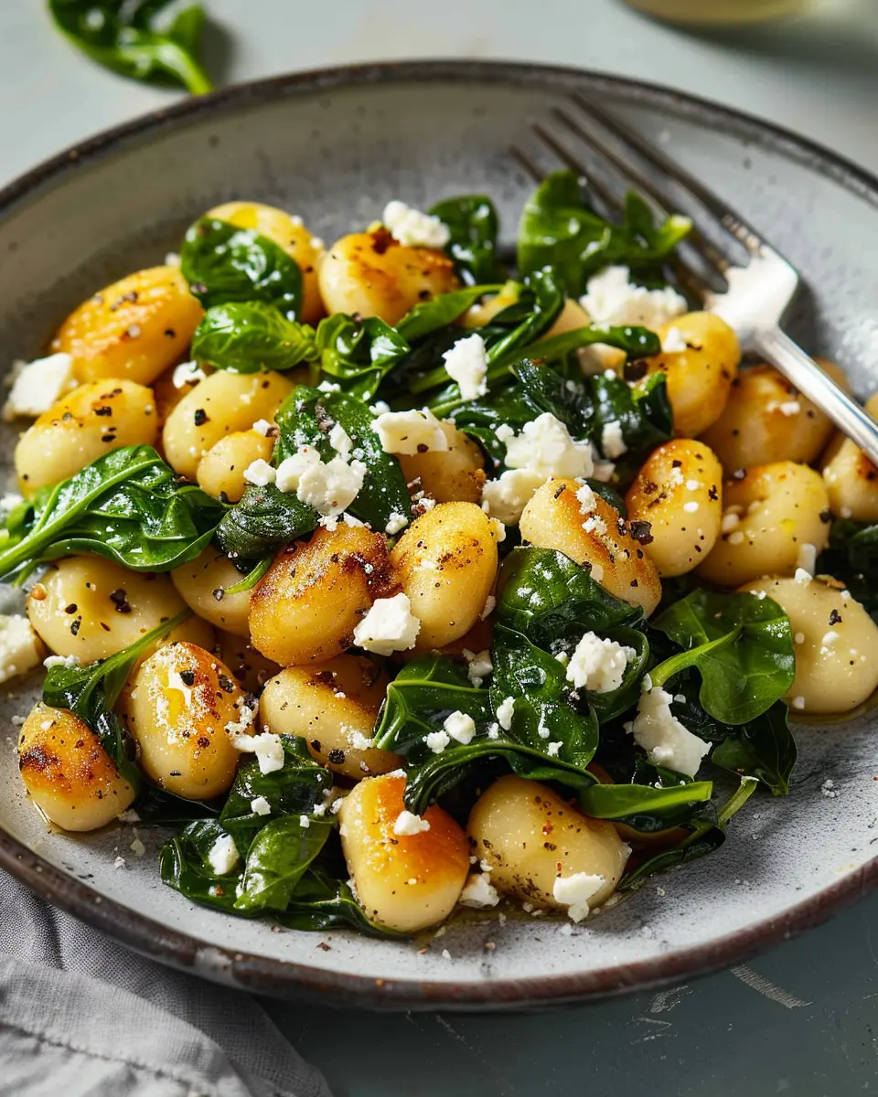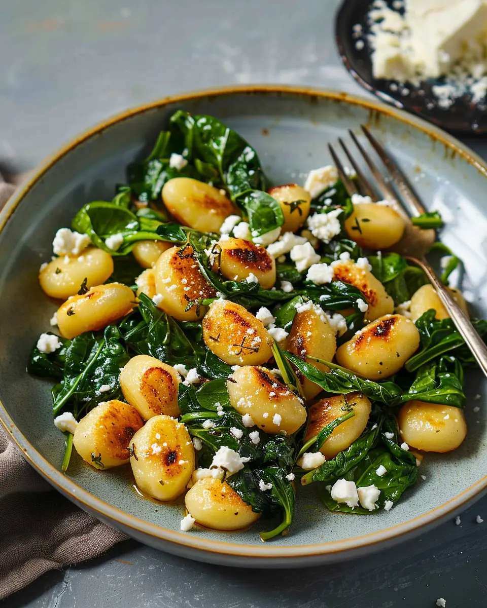 A comforting and easy-to-make dish that combines crispy gnocchi with the freshness of spinach and the creaminess of feta.