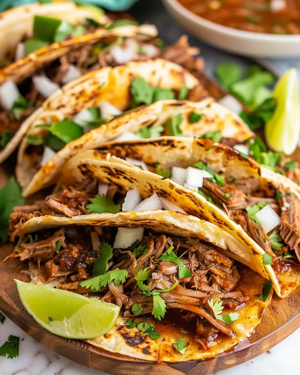 A delicious recipe for Crock Pot Birria Tacos that combines juicy meat and flavorful broth.