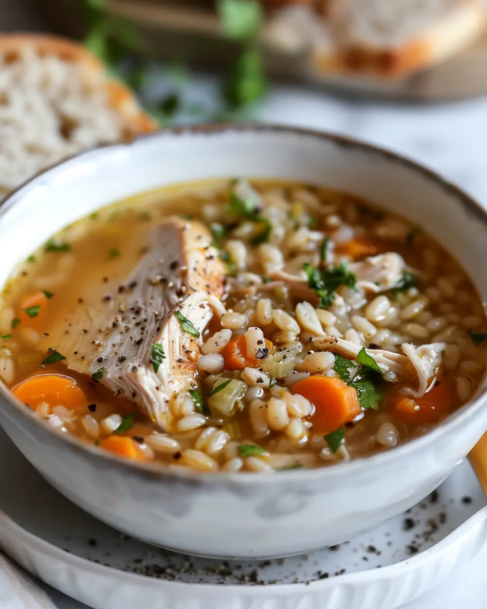 Now you’re ready to serve up a steaming bowl of deliciousness! Ladle the Crockpot Chicken and Barley Soup into bowls and garnish with fresh herbs if you like—parsley or thyme work beautifully for this dish.
