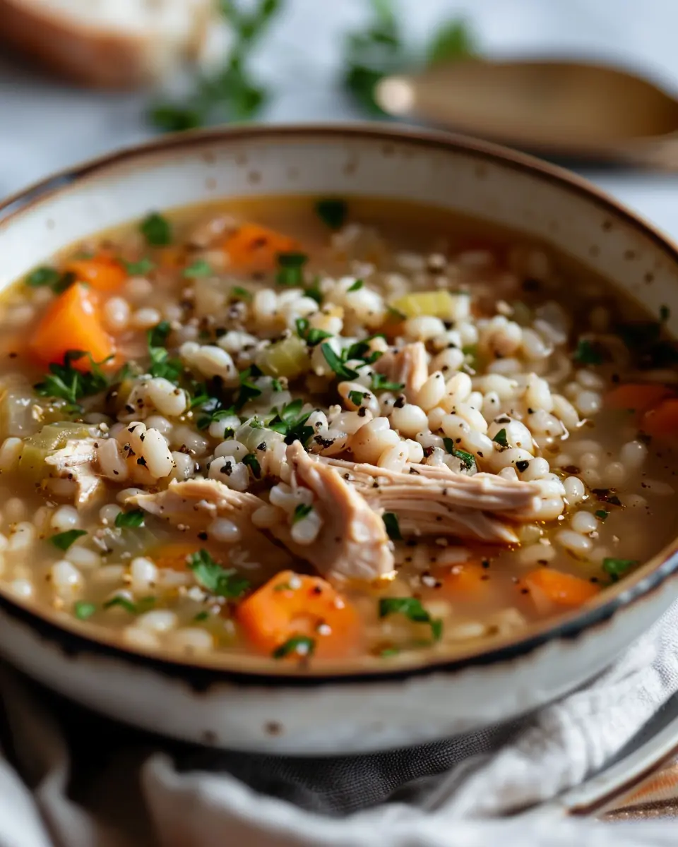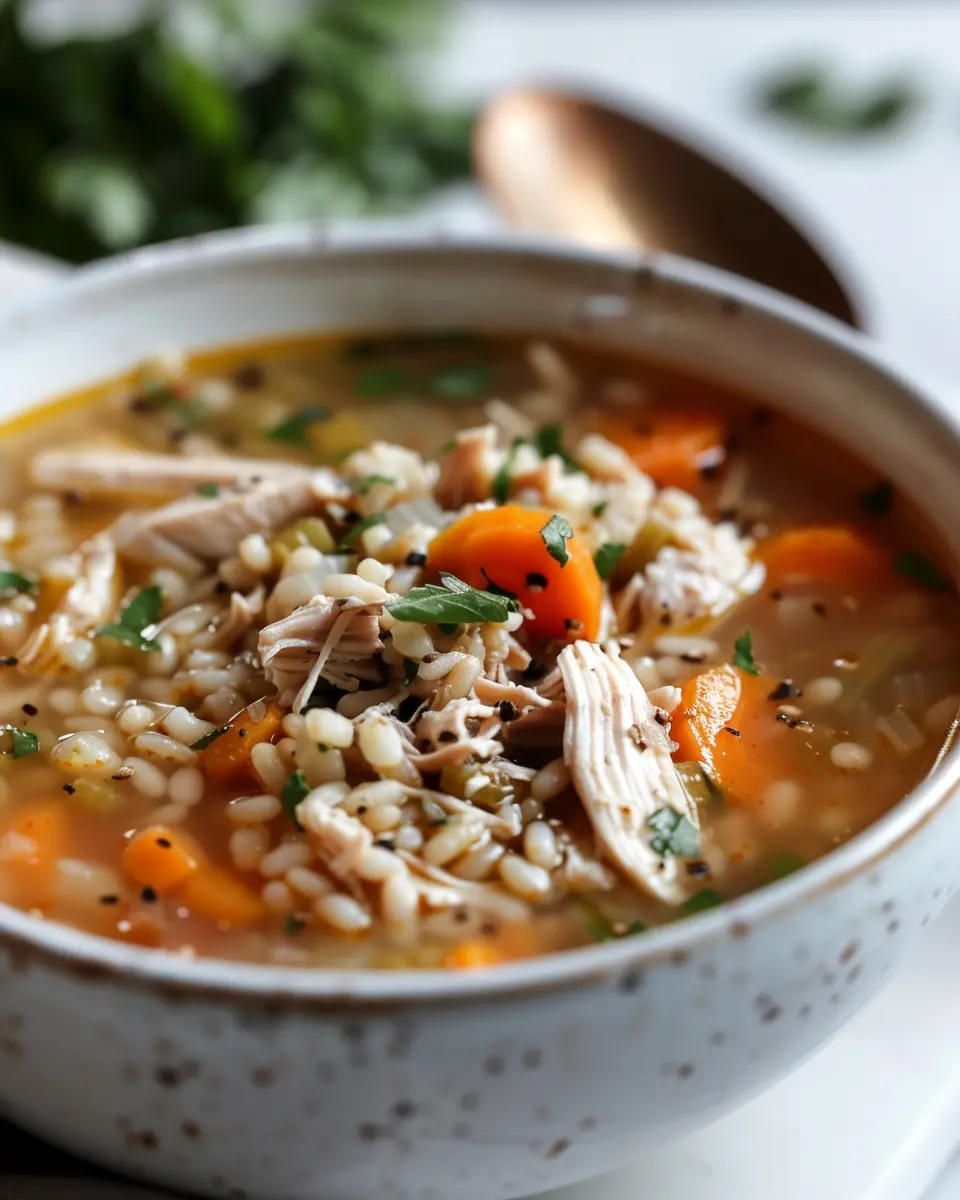 Enjoy the hearty and flavorful Crockpot Chicken and Barley Soup, perfect for a comforting meal any day of the week.