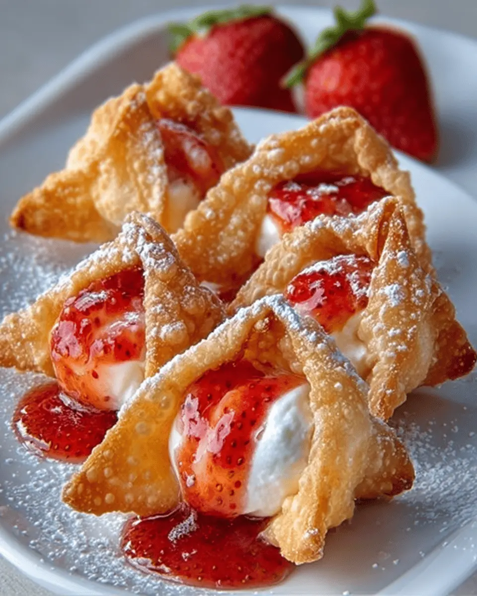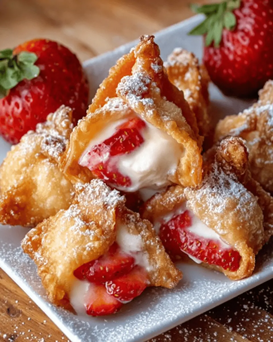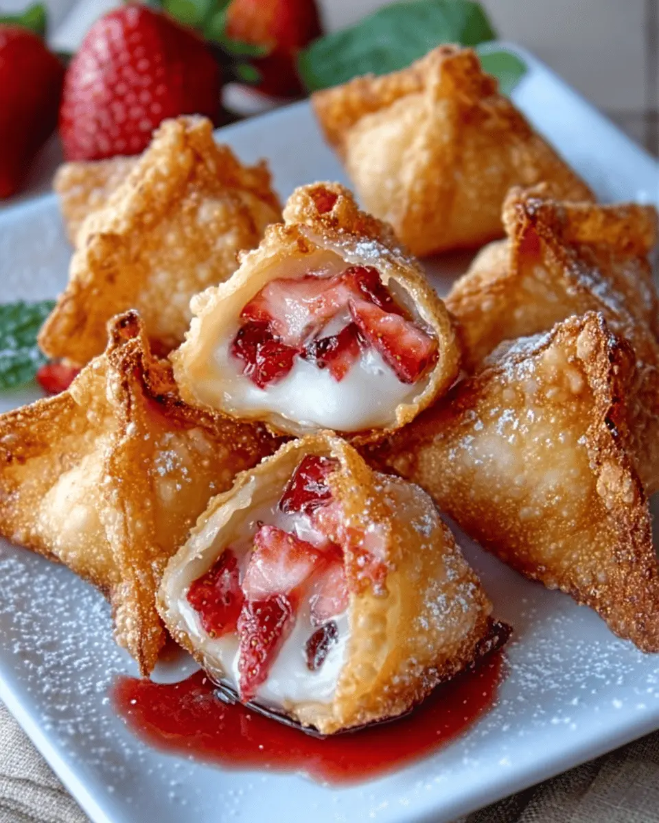 A delightful dessert combining the rich flavors of strawberry cheesecake with the crispy texture of deep-fried wontons.