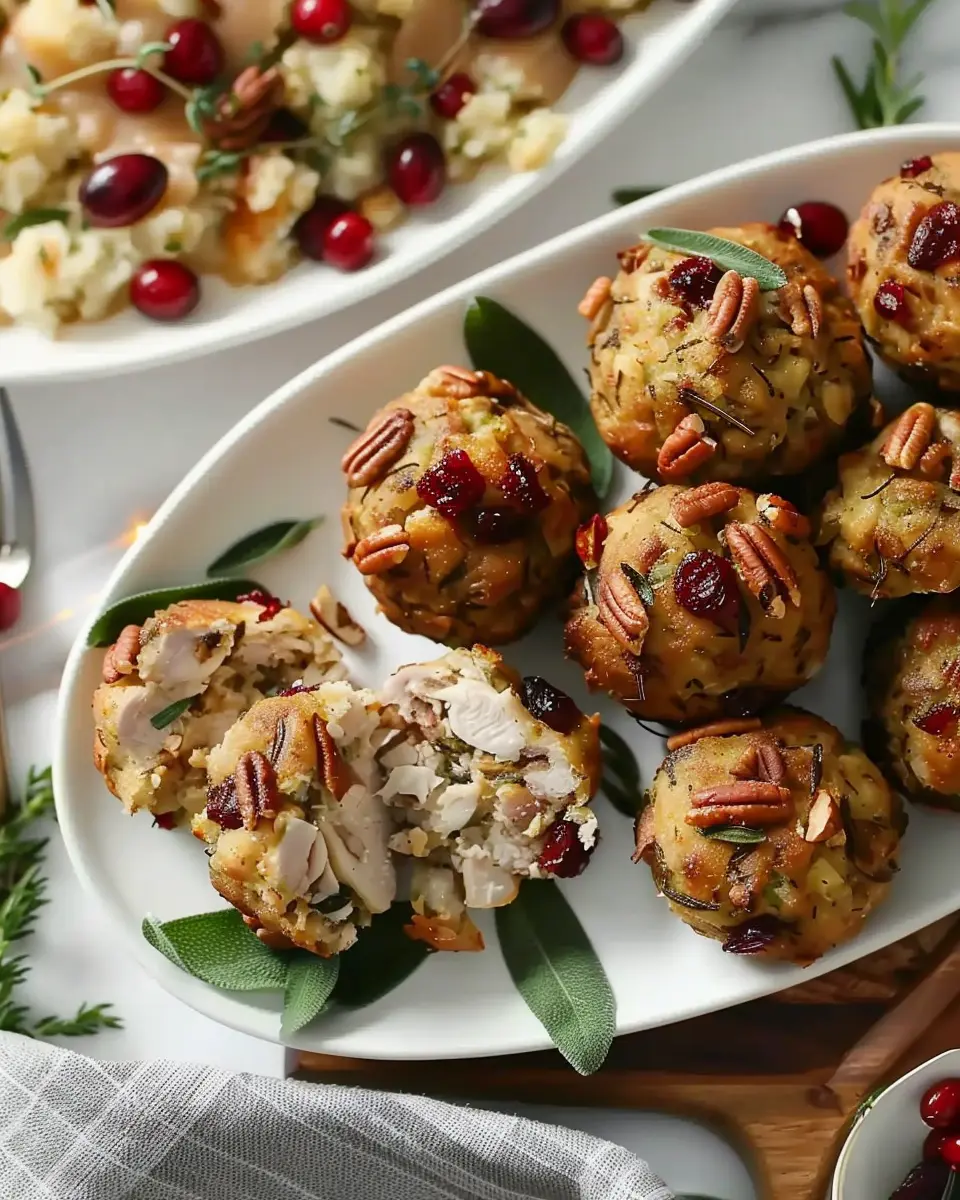 Delight in the festive flavors of cranberry and turkey with savory sage and crunchy pecans in these delicious stuffing balls, perfect for holiday gatherings.