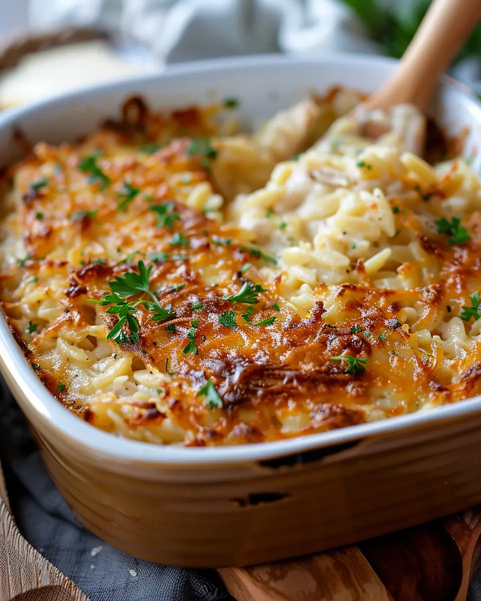 • Flavor enhancers: Don’t skimp on flavor—add 1 teaspoon of garlic powder and some fresh thyme or rosemary. These herbs elevate the dish and complete the French Onion Chicken Orzo Casserole experience.