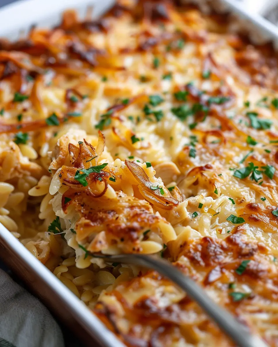 French Onion Chicken Orzo Casserole