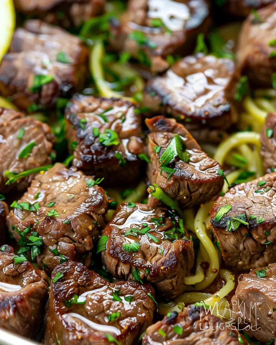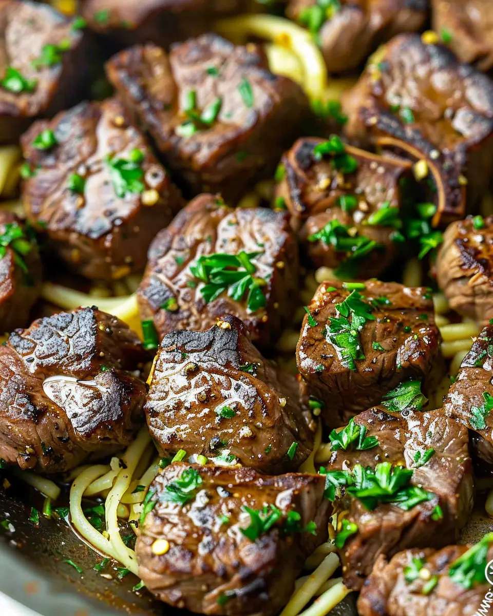 Perfectly cooked steak bites bathed in garlic butter, ideal for a quick yet delicious meal.