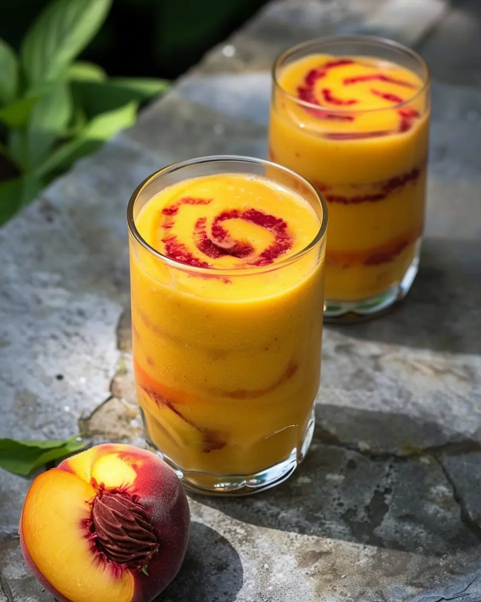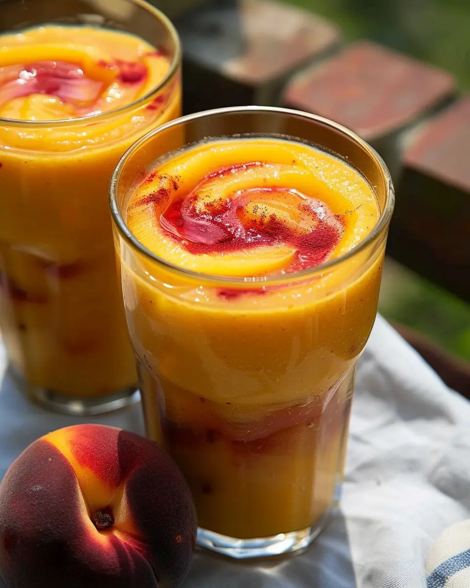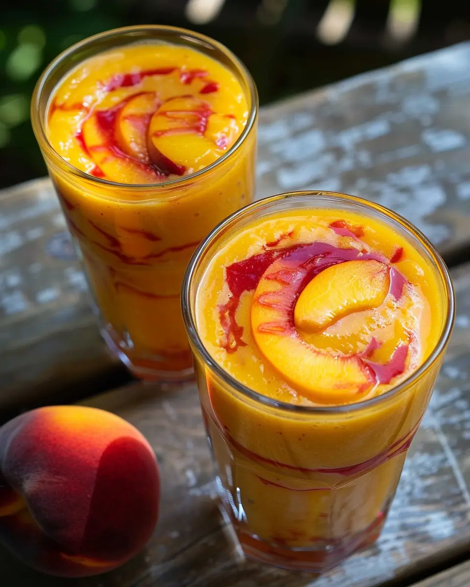A delicious and refreshing smoothie that combines the sweetness of peaches with the vibrant colors of a sunrise.