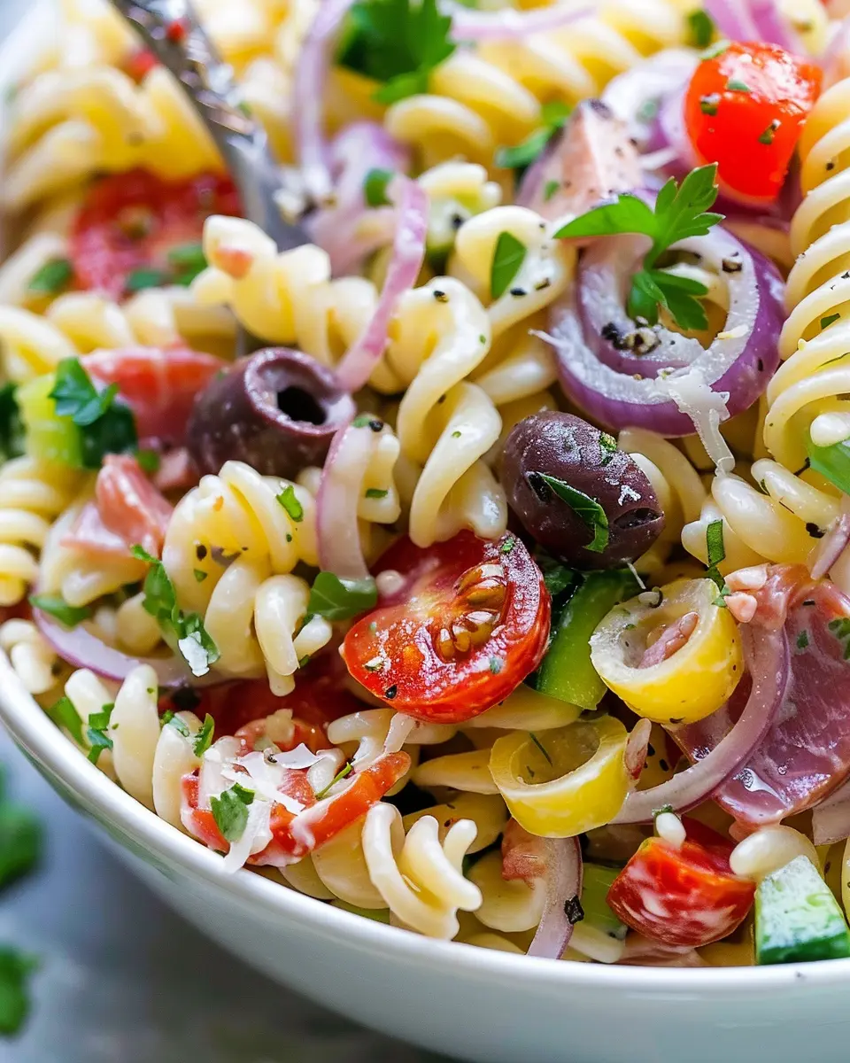 In closing, this Italian Pasta Salad Recipe is not just a dish; it’s a celebration of flavors and colors that will surely impress your friends and family. It’s versatile—perfect as a quick lunch or a side dish at gatherings. With turkey bacon, chicken ham, and an array of vibrant veggies, each bite is packed with nutrition and taste.