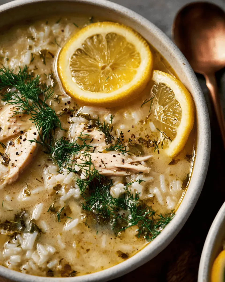 A delicious and comforting lemony Greek chicken and rice soup, perfectly flavored with dill.