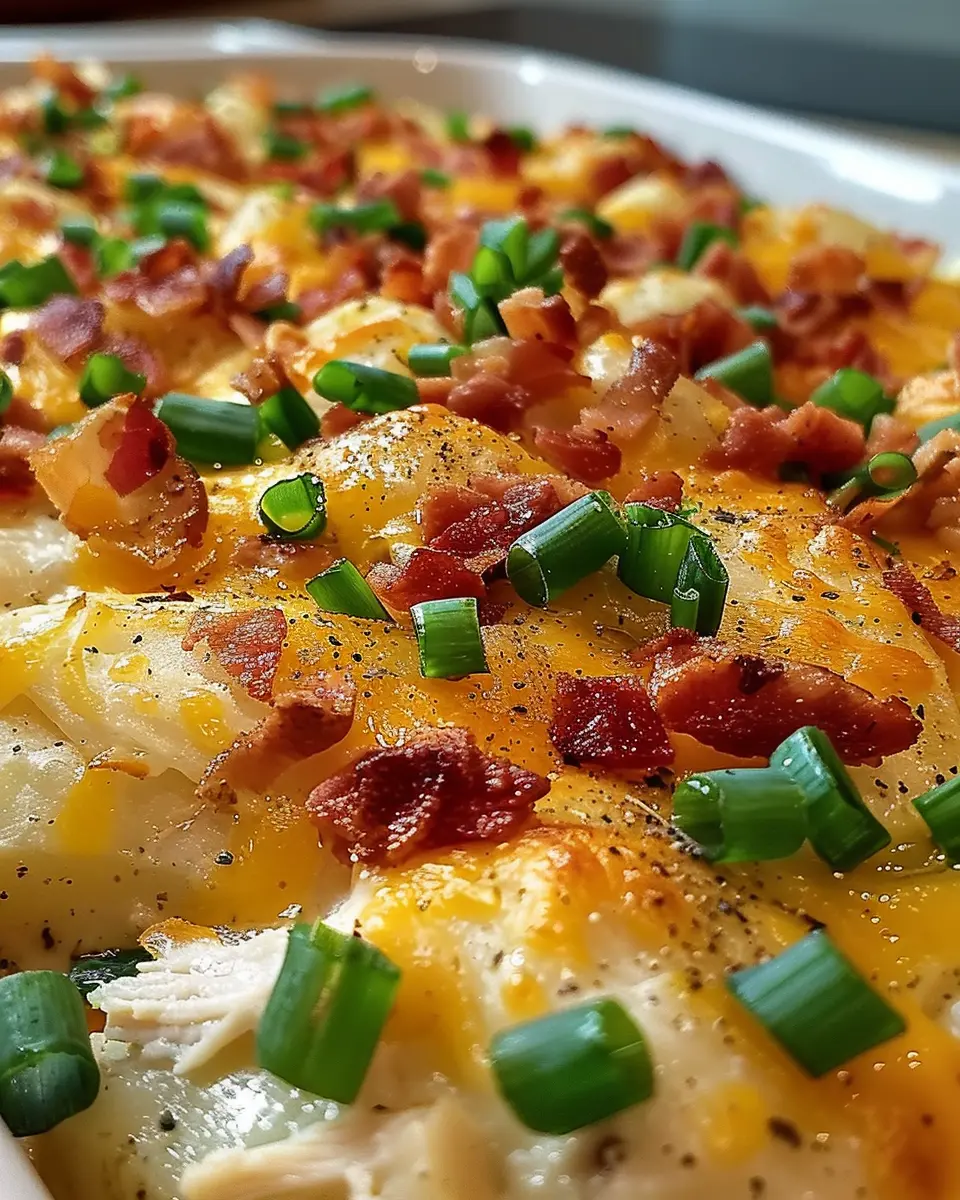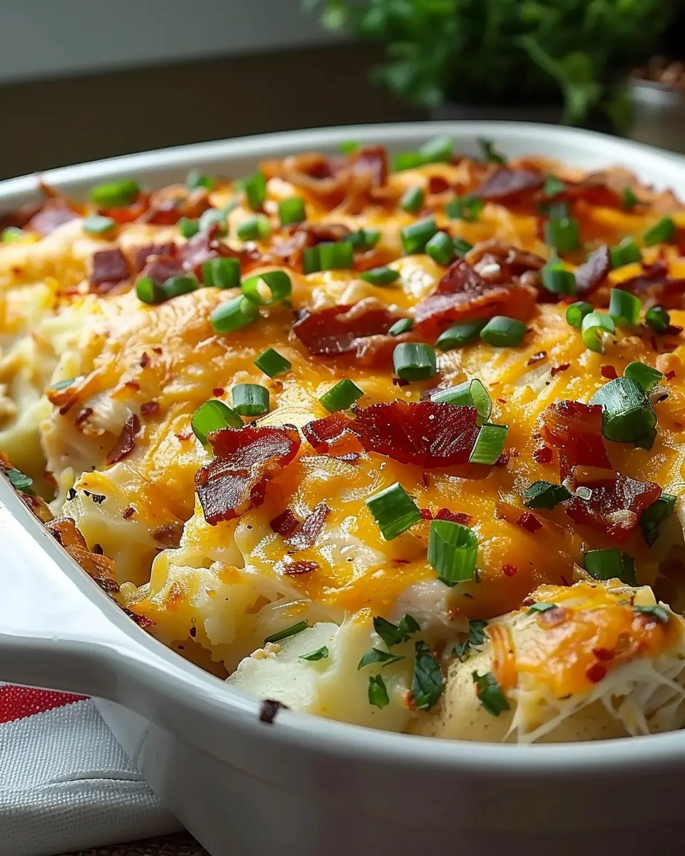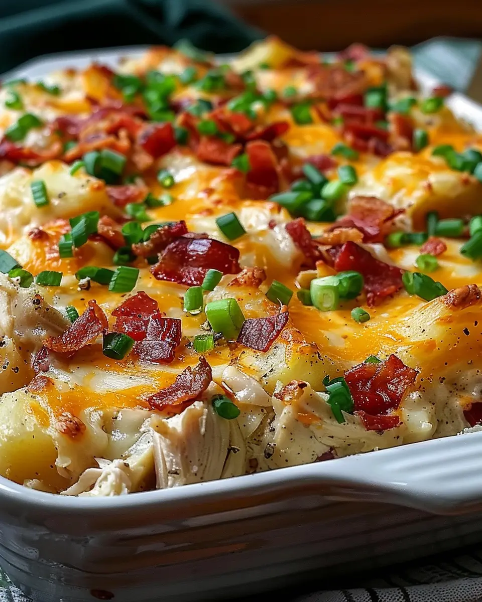 Enjoy the creamy, cheesy goodness of loaded baked potato and chicken casserole, a perfect dish for any comfort food lover.