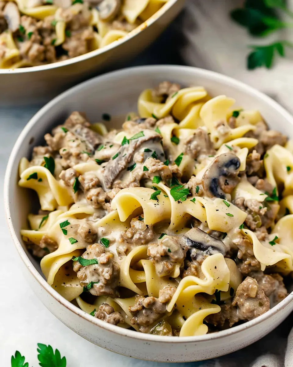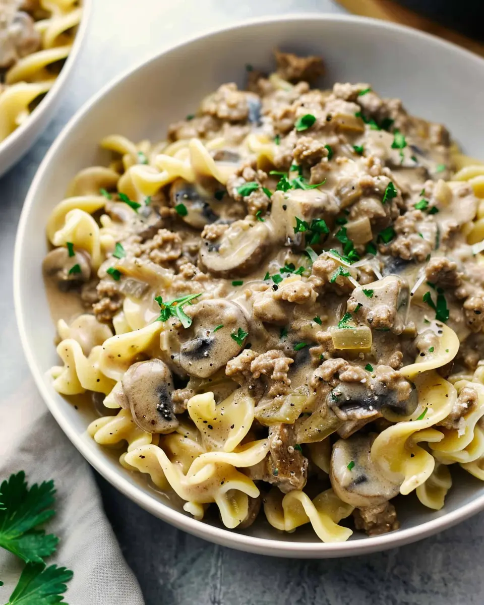 Enjoy a creamy, savory One Pot Ground Beef Stroganoff that’s simple to prepare, perfect for a weeknight dinner.