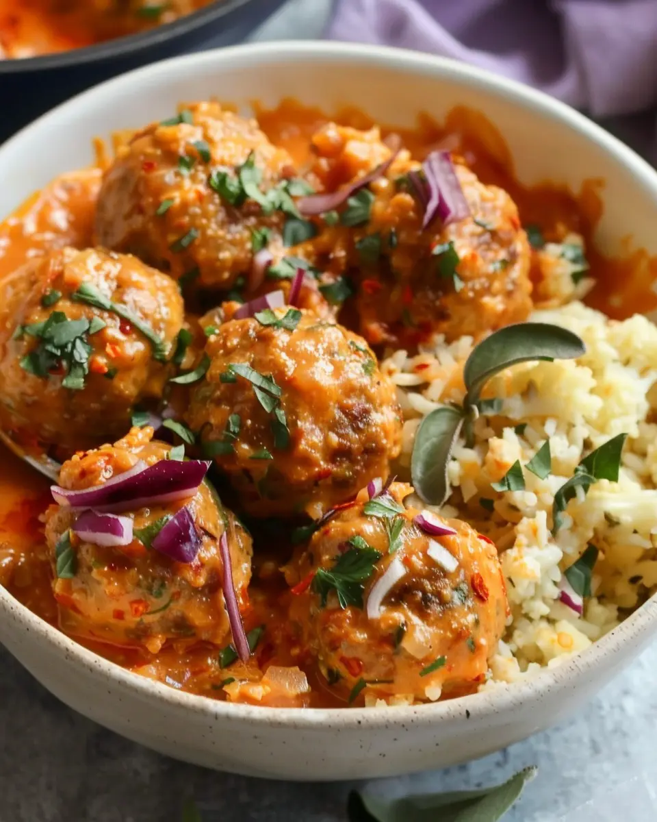 PrintRed Coconut Curry Meatballs: Easy Recipe with Cauliflower Rice