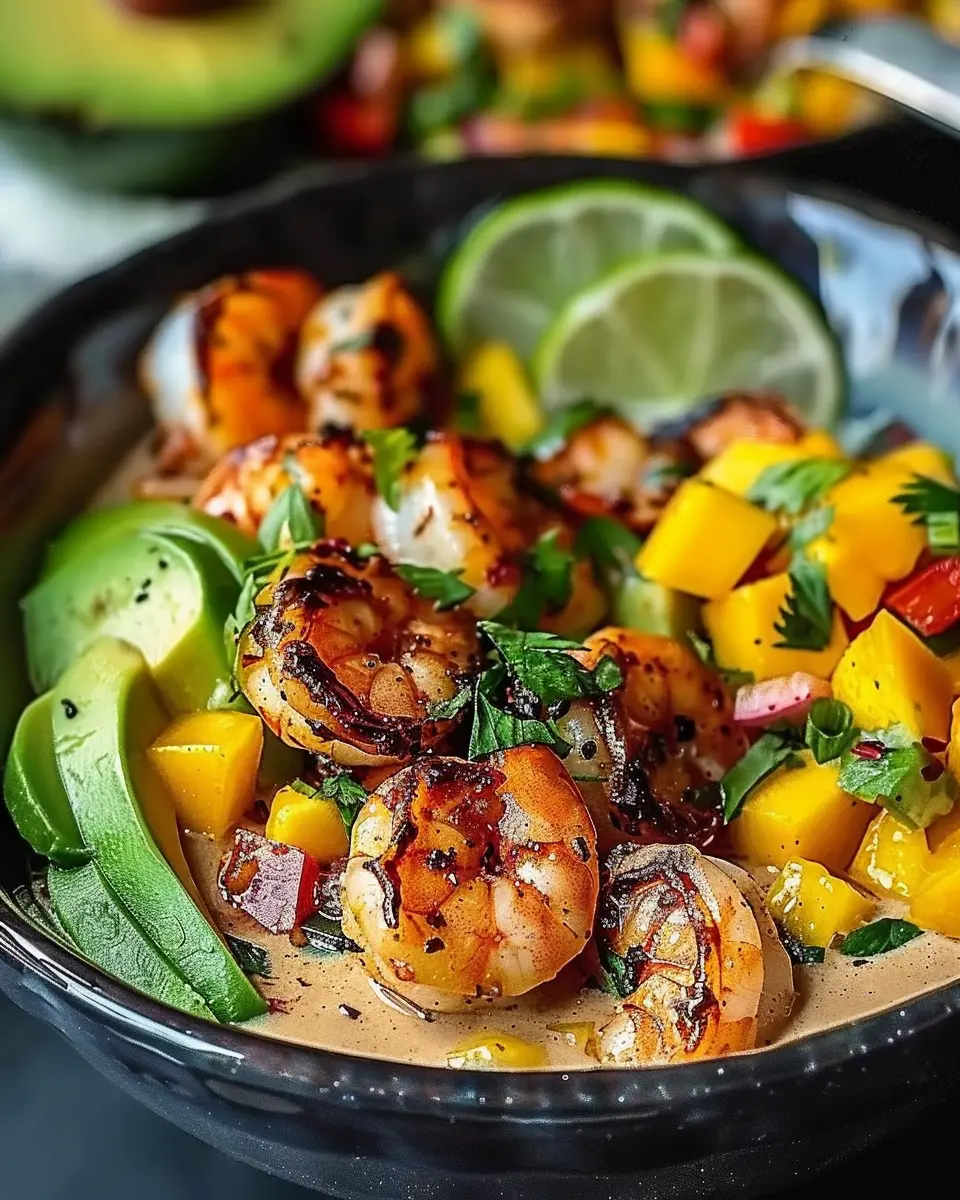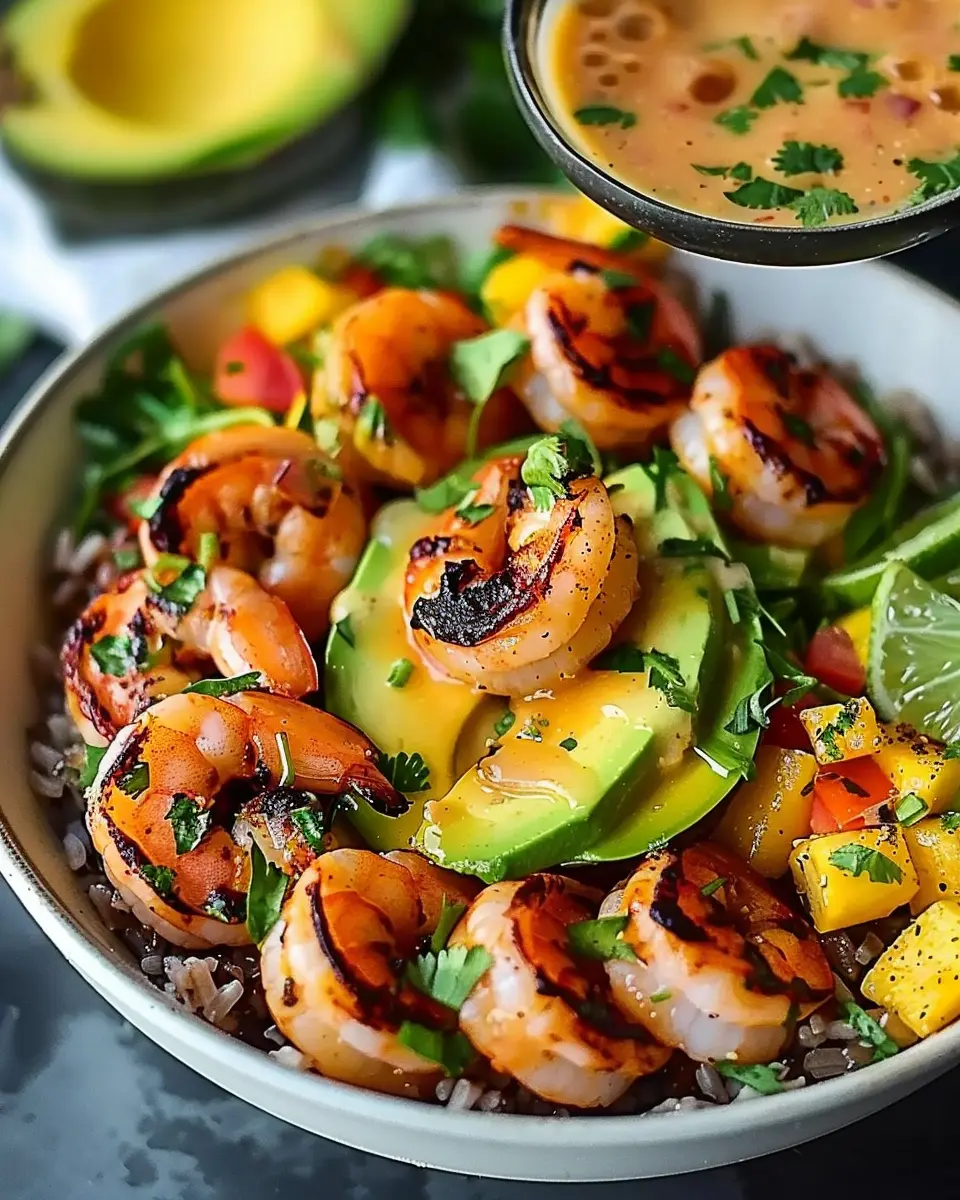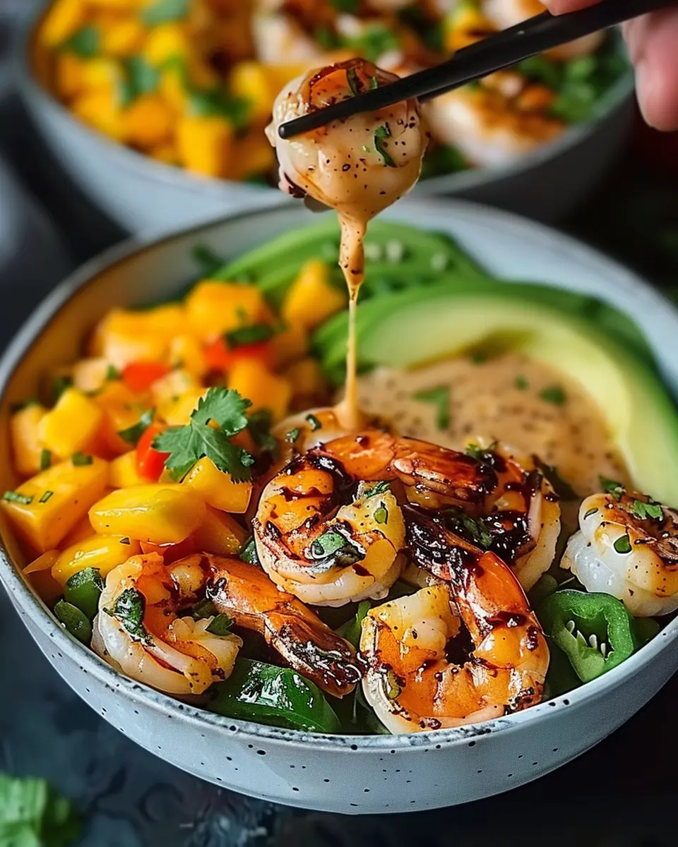 Delicious shrimp and avocado bowls topped with fresh mango salsa and a zesty lime-chili sauce for a vibrant meal.