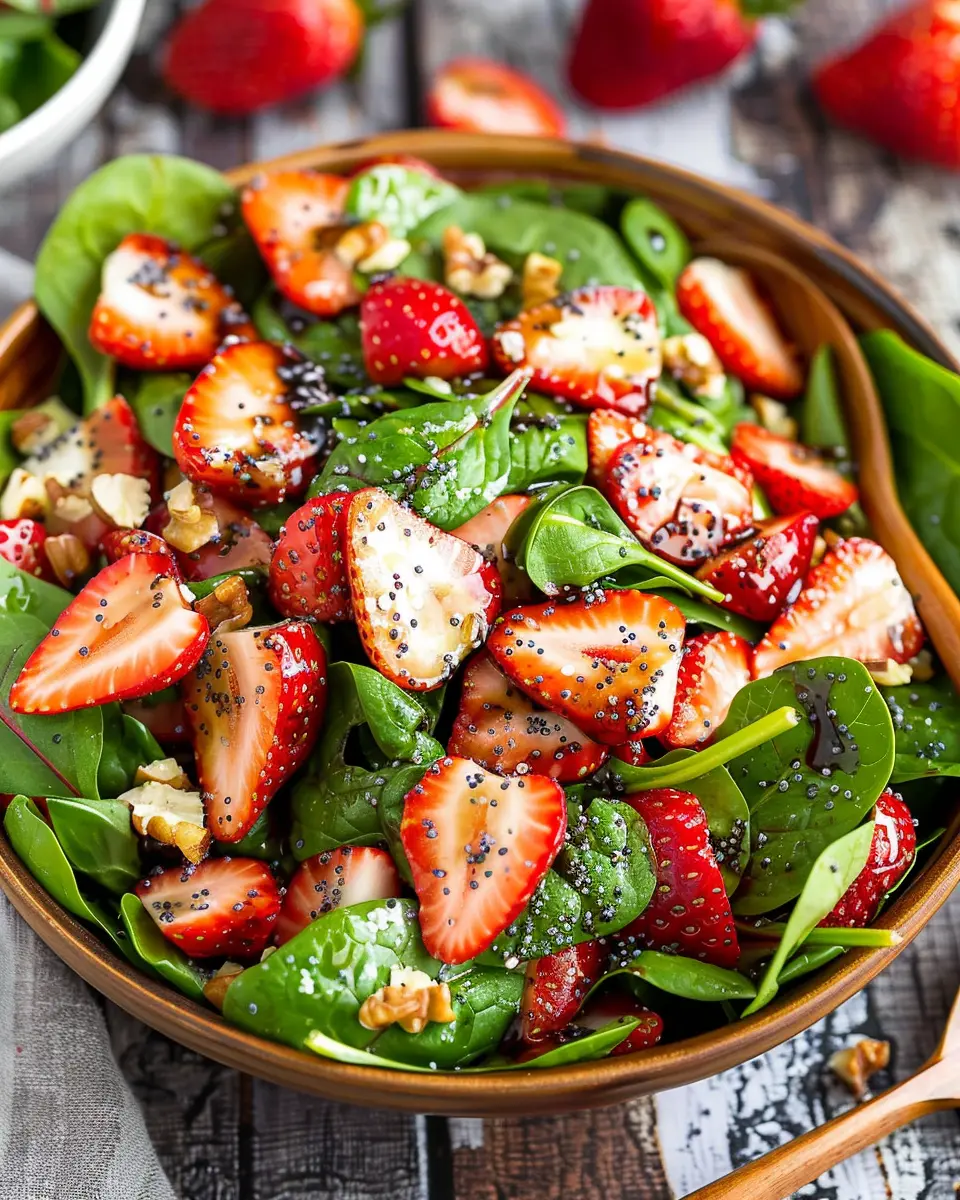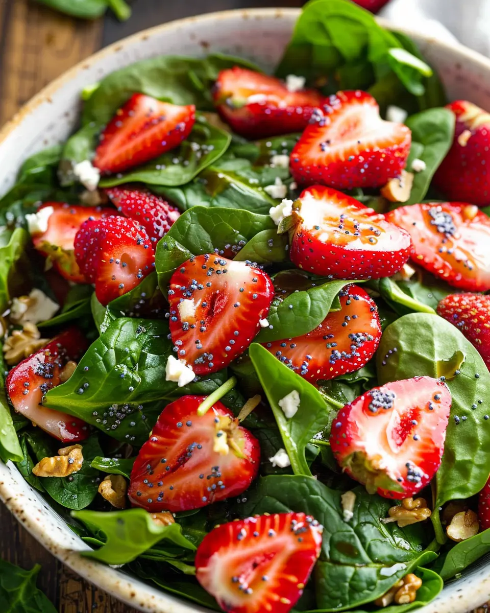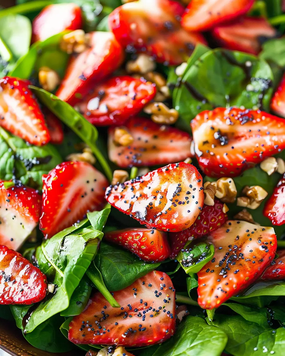 Discover the perfect blend of fresh spinach and strawberries, complemented by a delectable balsamic poppy seed dressing in this vibrant salad recipe.