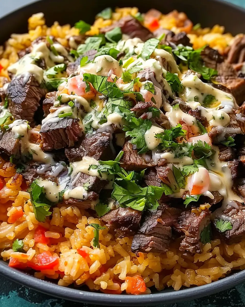 Now that everything is ready, it’s time to build your bowl! Start by layering the cooked rice as the base, followed by sliced steak. Drizzle the warm queso sauce generously over the top.
