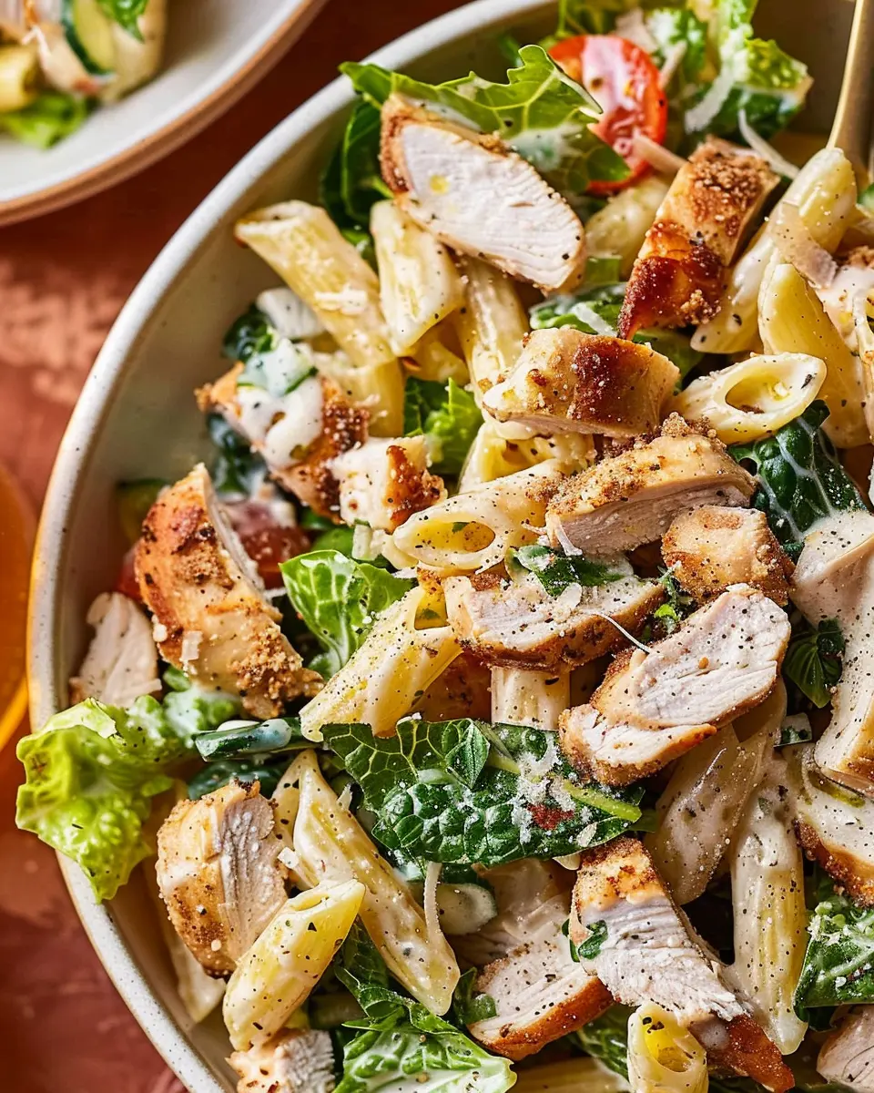 Discover the perfect blend of flavors in this Ultimate Chicken Caesar Pasta Salad with Turkey Bacon Delight, a dish that’s sure to impress!