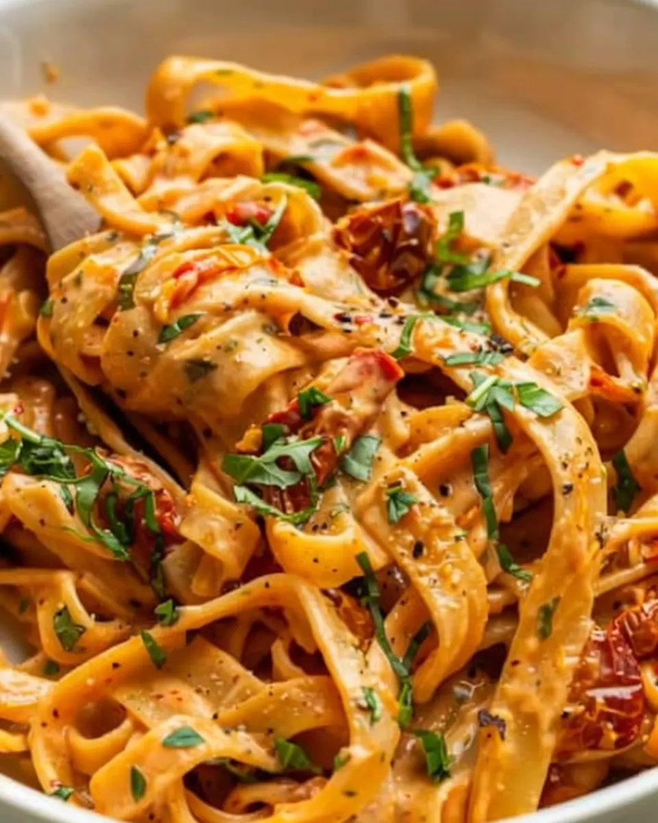 A deliciously creamy pasta dish made with sun dried tomatoes, perfect for vegans and pasta lovers alike.