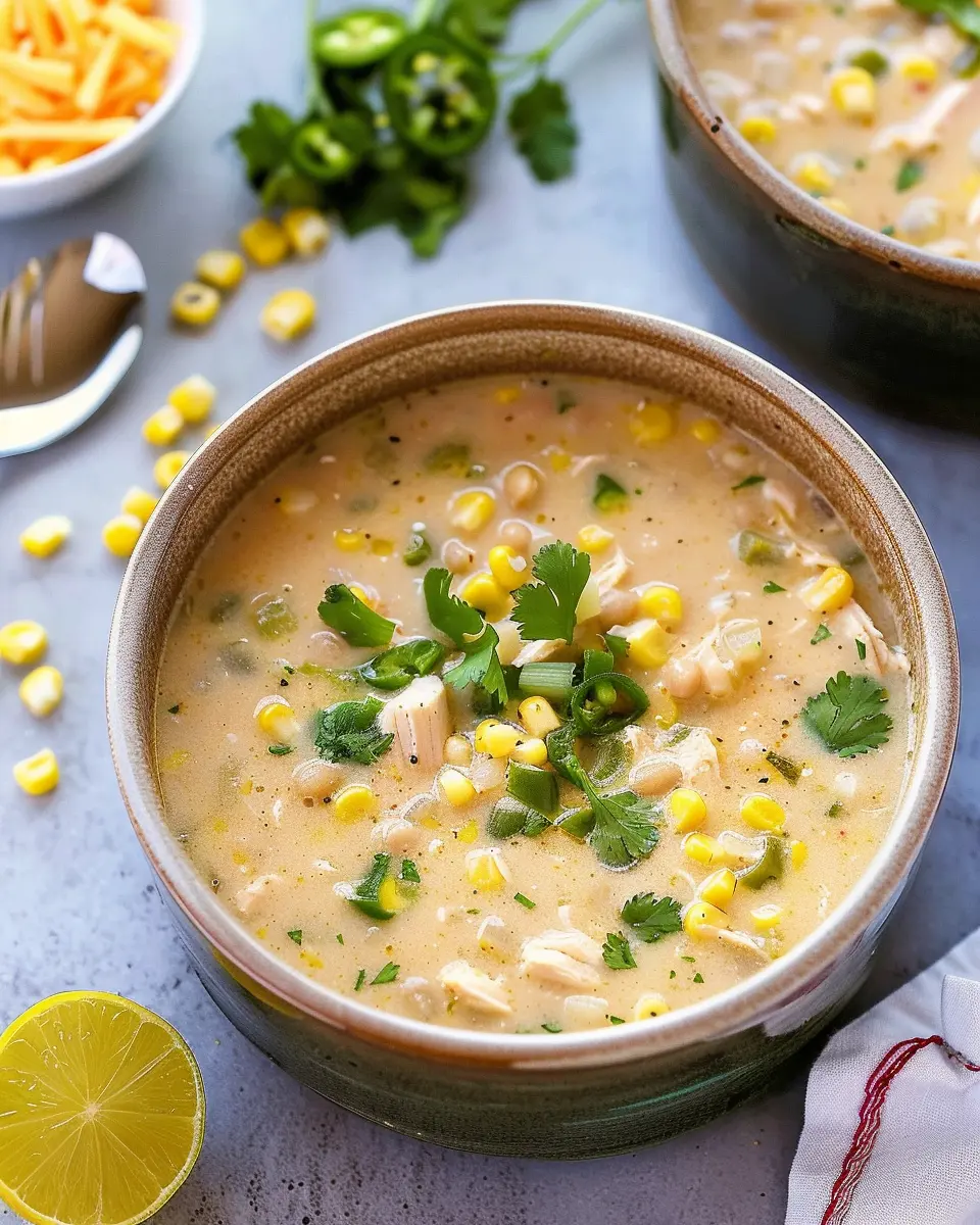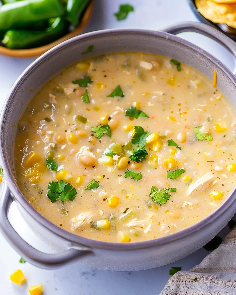 Enjoy a hearty bowl of White Chicken Chili with Corn packed with flavor and comfort.